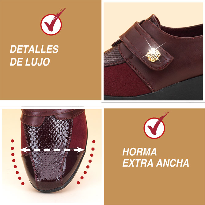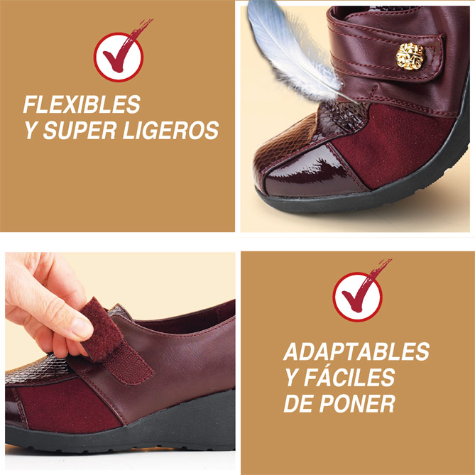 Ya puedes olvidarte del dolor de pies, las piernas cansadas o incluso los dolores de espalda… Porque los Zapatos Estilo & Relax poseen una novedosa Plantilla de Memory Foam que se adapta al pie y actúa como amortiguador para reducir el impacto en las articulaciones y la zona lumbar al caminar, aliviando así incómodas molestias. Además, detalles como su estudiado diseño, flexible y ligero, con horma extra-ancha y el cierre de velcro, que ofrece un ajuste perfecto sin presión ni roce, o su pequeña cuña con la altura recomendada por los podólogos, te permitirán pasear durante horas cómodamente. Y además, su original color burdeos, tan de actualidad, o los distintos acabados y el coqueto adorno, aportarán un elegante toque de color y glamour a tu vestuario.