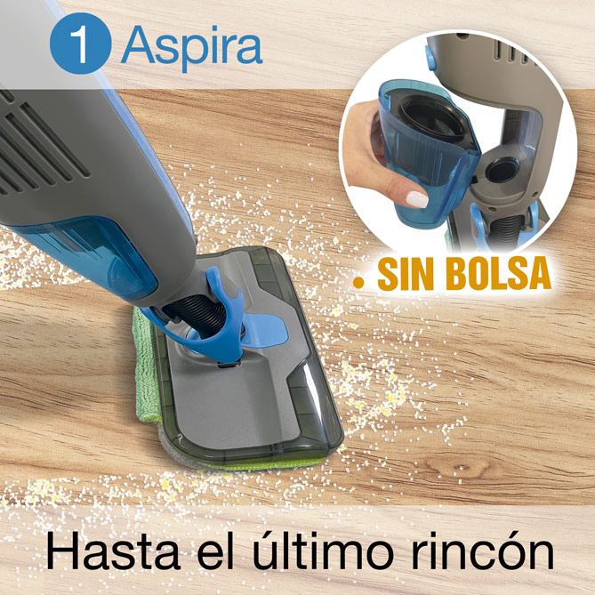 ¡Ya no tendrás que barrer antes de fregar, ni esperar a que se seque! ASPICLEAN “3 en 1” ha llegado para revolucionar la limpieza de tu hogar, porque permite aspirar, fregar y secar cualquier suelo de forma cómoda y rápida de una sola pasada. Sin cables y sin bolsa, este versátil aspirador te permitirá limpiar todo tu hogar de forma rápida y cómoda ¡sin necesidad de cambiar de aparato!