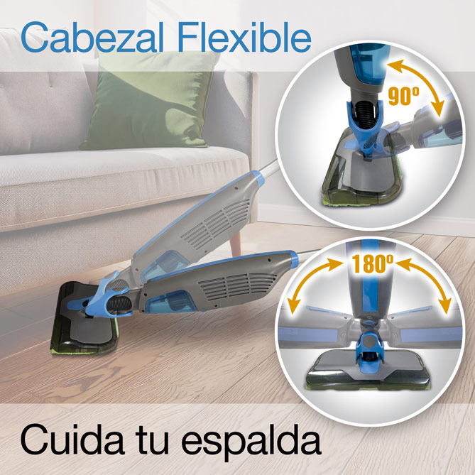 Con sólo pulsar un botón, pulveriza el suelo con agua para desincrustar todo tipo de manchas, restos de comida... y los aspira sin dejar ni rastro.