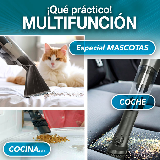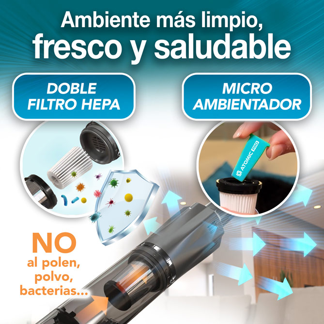 Si estás cansado de aspiradores grandes que no llegan a todas partes y de los aspiradores de mano que apenas tienen potencia, aquí tienes la solución definitiva: Atomic Pro. El aspirador compacto más avanzado que combina potencia industrial y diseño ultraligero, en un formato cómodo que cabe en tu mano. Y todo con la máxima comodidad: sin cables, con batería de larga duración recargable y sistema de vaciado higiénico con un solo clic. Atomic Pro es el aliado perfecto para mantener tu casa impecable sin esfuerzo.