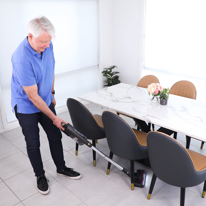 Slim Power Vac pesa poquísimo, así que podrás llevarlo fácilmente de una habitación a otra y limpiar las zonas más altas, gracias a su varilla telescópica, sin sudar la gota gorda. ¡Es más ligero que el resto de aspiradores pero con toda la potencia de un aspirador con cable!