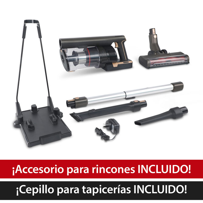 Slim Power Vac también incluye un accesorio para rincones profundos y estrechos, y un cepillo para tapicerías con el que podrás limpiar telas delicadas, sofás, cortinas y los asientos del coche.