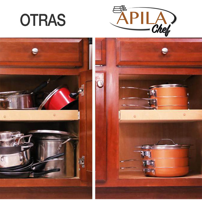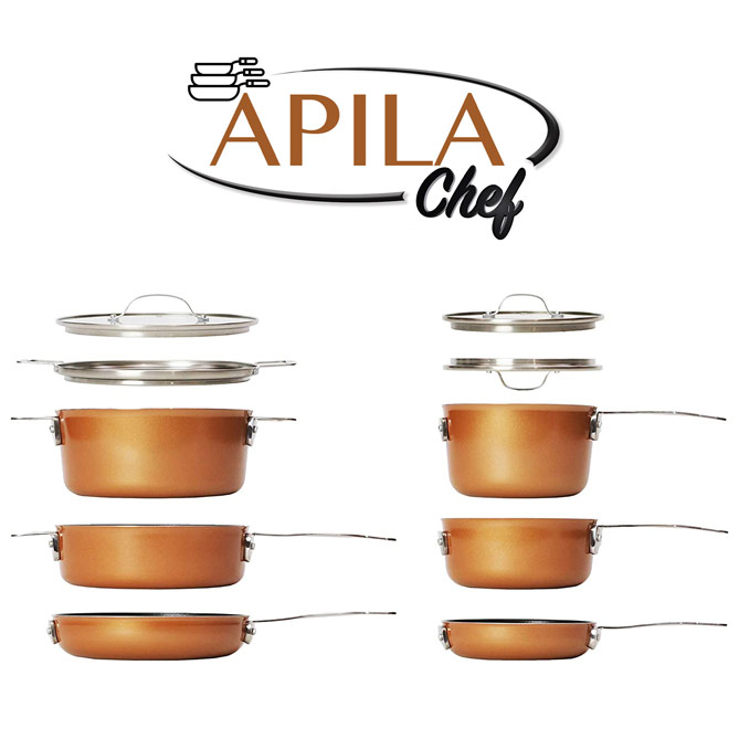 Para cocinar utilizamos tantas sartenes y cacerolas que luego es un problema guardarlas y que queden bien organizadas en los armarios, ¿verdad? La solución es la batería de cocina Apila Chef con la que encontrarás siempre todo ordenado y ahorrarás hasta un 40% de espacio. Además, sus 14 piezas tienen un revestimiento antiadherente de triple capa. ¡Nada se pega incluso sin utilizar aceite! Olvídate de las sartenes rayadas y de tener los armarios desordenados, Apila Chef ya está aquí para hacerte la vida más fácil.