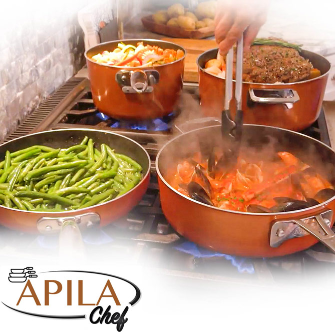 La batería de cocina Apila Chef está fabricada en acero robusto con revestimiento de aluminio antiadherente para que, cuando cocines, la comida no se pegue, y después sea mucho más fácil limpiarla. Su superficie de cocción antiadherente está recubierta con 3 capas y reforzada con cerámica y titanio. Estos materiales permiten que tanto las sartenes como las cacerolas sean más ligeras facilitando también su uso.