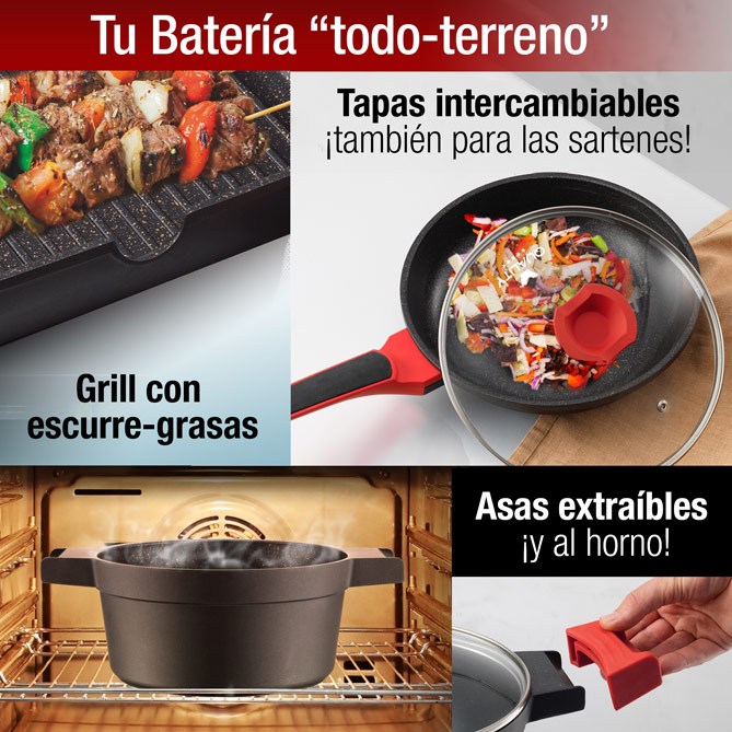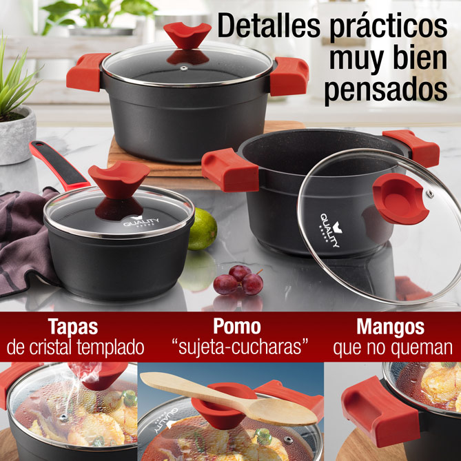 Indeformable, con un diseño que une tradición y vanguardia y un precio excepcional: las 9 piezas de QUALITY están forjadas en ALUMINIO FUNDIDO, sin soldaduras ni remaches: para durar toda la vida. Más resistentes, con Antiadherente GREBLON® (de Tecnología alemana) y todos los detalles prácticos que exige la cocina profesional, como la posibilidad de usar las ollas en el horno. Bases de Acero inoxidable aptas para todas las fuentes de calor, Tapas de Cristal templado, Asas de silicona extraíbles y, de REGALO, un Robot de Cocina y 8 complementos a juego. QUALITY es tu próxima Batería de Cocina. La definitiva.