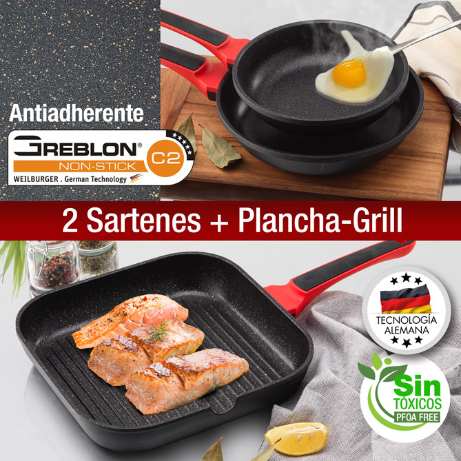 Cada pieza de QUALITY es super-resistente y, además, cuenta con 4 capas de recubrimiento antiadherente GREBLON® (de Tecnología alemana, libre de agentes tóxicos, como el PFOA*). Con acabado marmolado color cobre, permite cocinar casi sin aceite, conservando las vitaminas y el sabor de los alimentos. Ahorras ¡y ganas en salud para ti y tu familia! Además, las 9 piezas tienen fondo difusor de acero inoxidable que redistribuye el calor de forma más eficiente que una cazuela normal, consiguiendo una cocción hasta un 35% más rápida y homogénea: son perfectas para cocinar a fuego lento, con poca agua, sin perder temperatura ni un ápice de sabor durante la cocción.