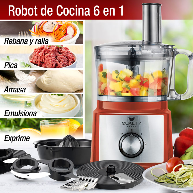 La Batería QUALITY también incluye un Robot de Cocina “6 en 1” que emulsiona, rebana, ralla, pica, amasa y exprime. Compacto, de gran capacidad (2 litros aprox), potente (750W) y muy fácil de usar, incorpora 3 accesorios para picar, amasar y emulsionar; disco cortador con 3 cuchillas intercambiables -para corte fino, medio y grande-; y exprimidor. ¡Qué práctico!