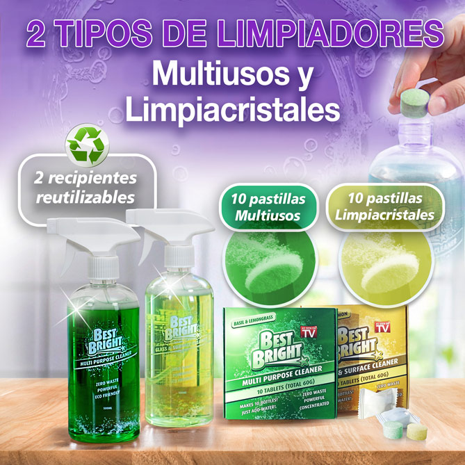 Además, incluye 10 pastillas del limpiacristales y limpiador de superficies más potente, y otras 10 del limpiador multiusos más eficaz. Solo tienes que llenar de agua sus 2 recipientes reutilizables, echar la pastilla que necesites ¡y no habrá quien te pare cuando quieras limpiarlo todo!