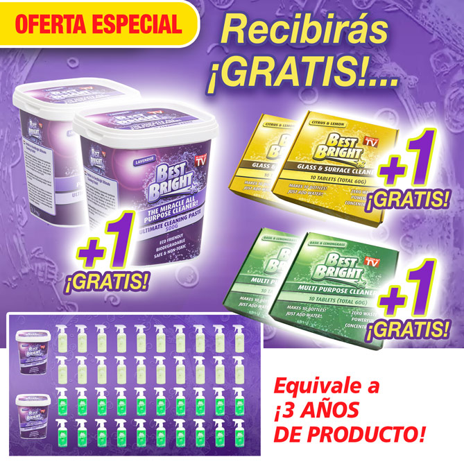 Y cuando hagas tu pedido, no te olvides de preguntar por el set Best Bright Pro que incluye un práctico pulverizador para el limpia cristales y limpiador de superficies, y las almohadillas de repuesto para la mopa pulverizadora y la escobilla de goma. Haz tu pedido ahora mismo, ¡llama ya!