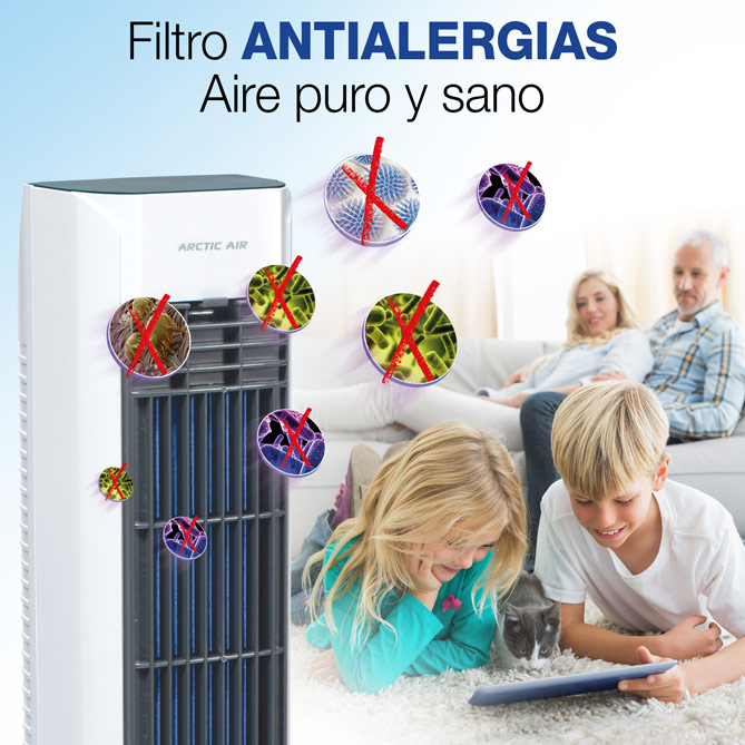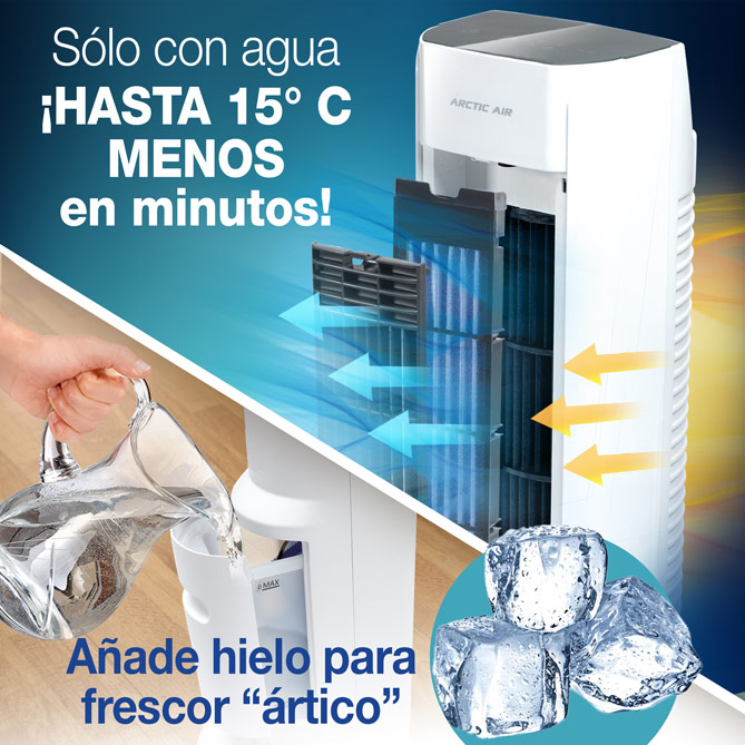 ¿Quieres disfrutar en casa de un frescor como el del Aire Acondicionado sin el alto gasto que supone instalarlo, mantenerlo y usarlo? Ahora puedes, con el Enfriador Evaporativo ARCTIC AIR, tu nuevo aliado para tu confort ¡y tu bolsillo! Sólo consume 55W -como una bombilla-, pero baja en minutos la temperatura ambiente hasta 15º C expulsando una brisa ligeramente humedecida que no reseca el ambiente. Sin instalación ni sacar tubos por la ventana, ARCTIC AIR es imprescindible para no sufrir el calor del verano, dormir y ver la tele sin sudar, teletrabajar “a gusto”… Un lujo a tu alcance que aprovecharás todo el año gracias a su diseño “4 en 1”: también es un Ventilador sin aspas, un Humidificador y un Aromatizador. Silencioso, fácil de usar y con 3 velocidades, es garantía de salud: su potente filtro atrapa los contaminantes para que respires un aire puro, libre de alérgenos. ¡Es la mejor inversión para mejorar la calidad de vida de toda la familia!