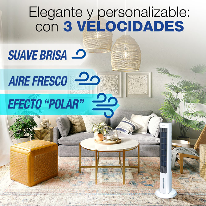 2-SELECCIONA LA VELOCIDAD DEL VENTILADOR: desde su panel de control táctil -situado en la parte superior para que lo manejes cómodamente-, elige entre 3 velocidades -”suave brisa”, ”aire fresco” y “efecto polar”- para un clima siempre a tu gusto. Supersilencioso, con temporizador de hasta 12 horas y autoapagado, podrás usarlo toda la noche para dormir plácidamente ¡incluso cuando el calor es insoportable!