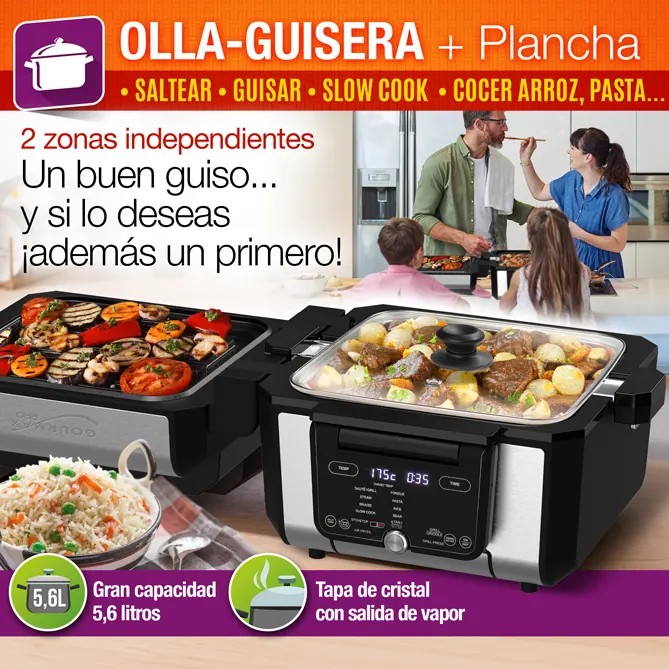 Con GOURMAX PRO también disfrutarás de los mejores guisos. Su olla de 5,6 litros de capacidad con tapa de vidrio es perfecta para preparar platos deliciosos para toda la familia. Además, podrás usar la otra bandeja como plancha o parrilla y, de este modo, preparar el primer plato y el segundo a la vez.
