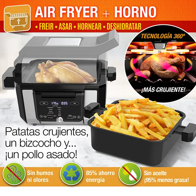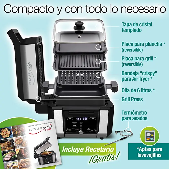 ¿Te has cansado de acumular aparatos en la cocina que solo sirven para una cosa y que luego tienes que fregar? ¡Pásate a GOURMAX PRO! El único electrodoméstico que sirve para todo, porque asa, cuece, hornea, guisa, saltea, gratina, deshidrata, cocina al vapor, fríe sin aceite…Basta pulsar un botón y tendrás a tu disposición una plancha, una parrilla, una olla de gran capacidad, una freidora de aire, un horno, una sandwichera… ¡Lo que necesites! Y todo, sin humos ni apenas aceite, sin manchar, ahorrando electricidad, tiempo y espacio.