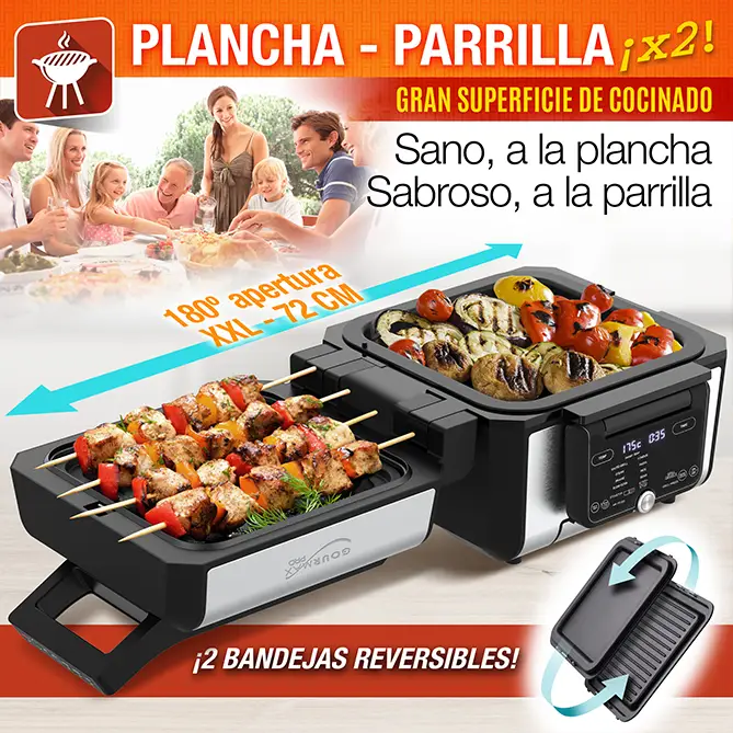 GOURMAX PRO cuenta con dos bandejas reversibles plancha-parrilla. Puedes cocinar con una sola o con las dos a la vez, así tienes el doble de superficie, ahorras tiempo y no se mezclan los sabores. Son perfectas para preparar el plato principal y la guarnición… Y puedes combinarlas como quieras, ¡solo tienes que darles la vuelta!