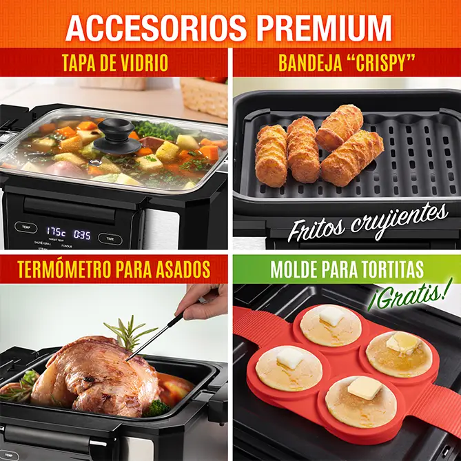 Y ahora con nuestra Maxi Oferta, ¡con un 40% de descuento! Además, podrás probarlo durante 60 días sin compromiso y te enviaremos, gratis, una bandeja reversible adicional, una rejilla air fryer, una tapa de vidrio, el termómetro, un fantástico recetario y un molde de silicona para tortitas. ¡Con GOURMAX PRO no te va a faltar de nada para triunfar en tu cocina!