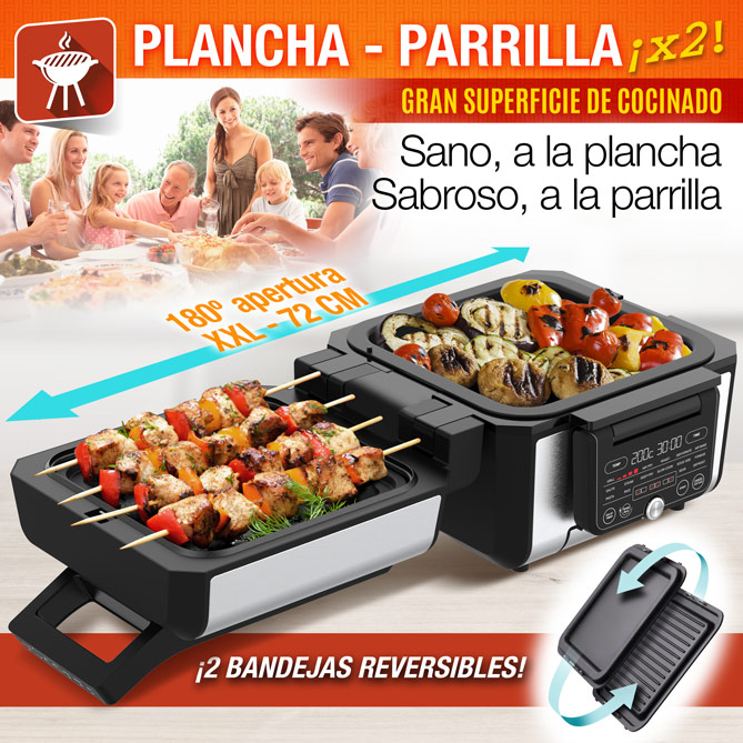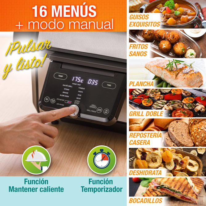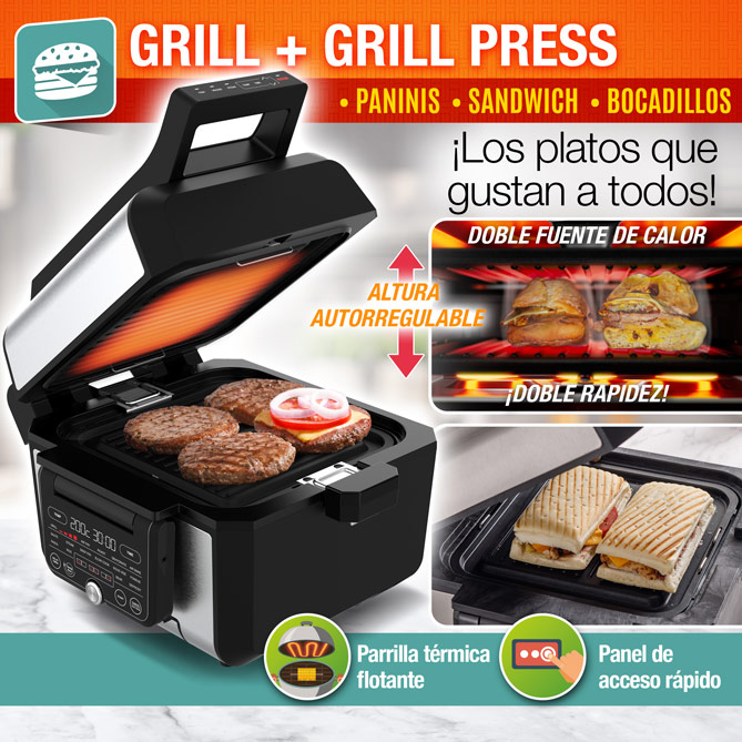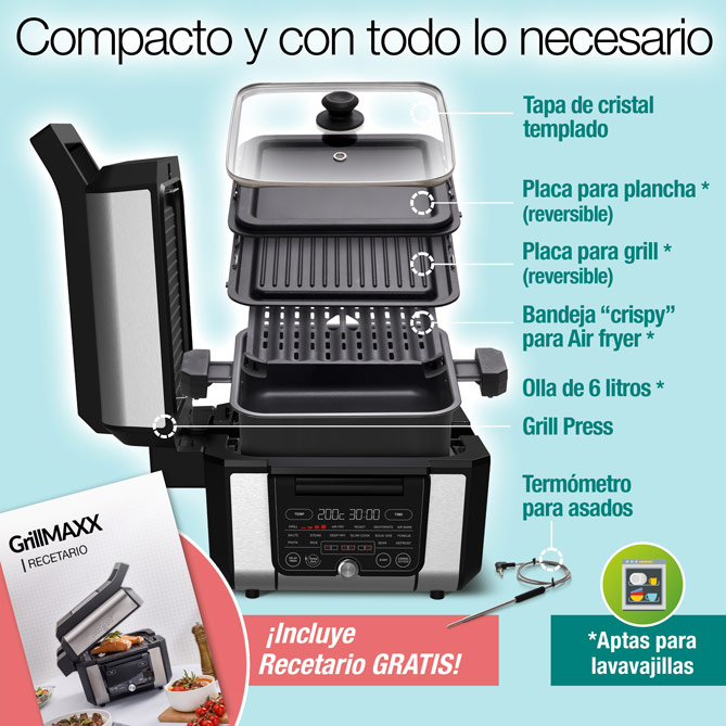 ¿Te has cansado de acumular aparatos en la cocina que solo sirven para una cosa y que luego tienes que fregar? ¡Pásate a GRILLMaxx! El único electrodoméstico que sirve para todo, porque asa, cuece, hornea, guisa, saltea, gratina, deshidrata, cocina al vapor, fríe sin aceite… Basta pulsar un botón y tendrás a tu disposición una plancha, una parrilla, una olla de gran capacidad, una freidora de aire, un horno, una sandwichera… ¡Lo que necesites! Y todo, sin humos ni apenas aceite, sin manchar, ahorrando electricidad, tiempo y espacio.