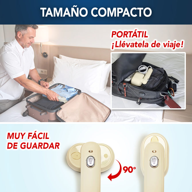 Con menos de 1 kilo de peso y un diseño compacto, Magic Iron es perfecta para llevarla de viaje. Ya estés en casa, en el despacho, en un hotel o de vacaciones, siempre tendrás una forma rápida y cómoda de eliminar arrugas. Se guarda fácilmente en cualquier maleta o armario, convirtiéndose en tu aliada perfecta para mantener tu ropa impecable en cualquier momento.