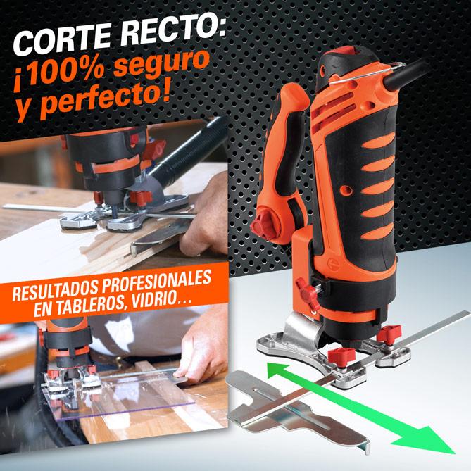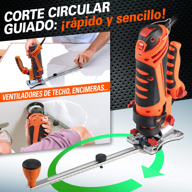 No hay proyecto que se resista a MULTI TWIST... ¿Quieres instalar un ventilador de techo o un plafón LED para ahorrar en la factura de la luz? Fija el diámetro que quieras con la Guía de Corte Circular y consigue un trabajo redondo, sin complicaciones. ¿Necesitas un nuevo tablero para el escritorio? Sin problema, la Guía de Corte Recto te permite hacer cortes asistidos, 100% seguros y perfectos, sin riesgos de desvío o error, en madera… y en pladur, vidrio o azulejo. ¿Tienes que hacer contornos de enchufes, interruptores o cajas de luz? Con las Brocas especiales de corte lateral podrás perforar en cualquier punto y luego cortar en todas las direcciones en un único movimiento, ¡incluso en “zig zag”!
