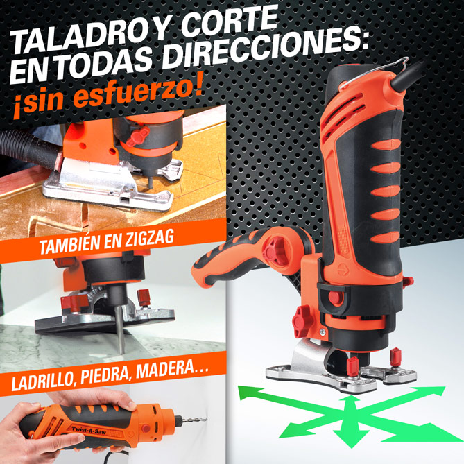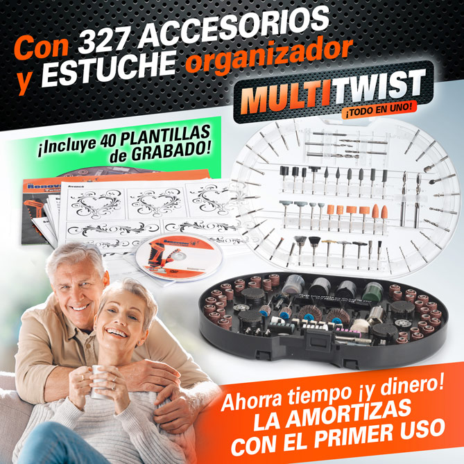 ¿Quieres hacer arreglos y reformas en casa sin gastar un dineral en contratar profesionales? ¡Dicho y hecho! Con MULTI TWIST, la nueva Herramienta “Todo en Uno” ¡que te ahorrará tiempo, dinero y esfuerzo! Ligera, compacta, segura y muy fácil de usar -incluso si el bricolaje no es lo tuyo-, gracias su gran potencia y sus 327 accesorios, corta, taladra, pule, fresa, lija... todos los materiales, con resultados profesionales. ¡Hasta graba cristal y metal, quita el óxido y afila! Con Estuche para tenerlo bien organizado, es la mejor inversión: al precio que están los servicios de “manitas”, ¡la amortizarás con el primer uso!