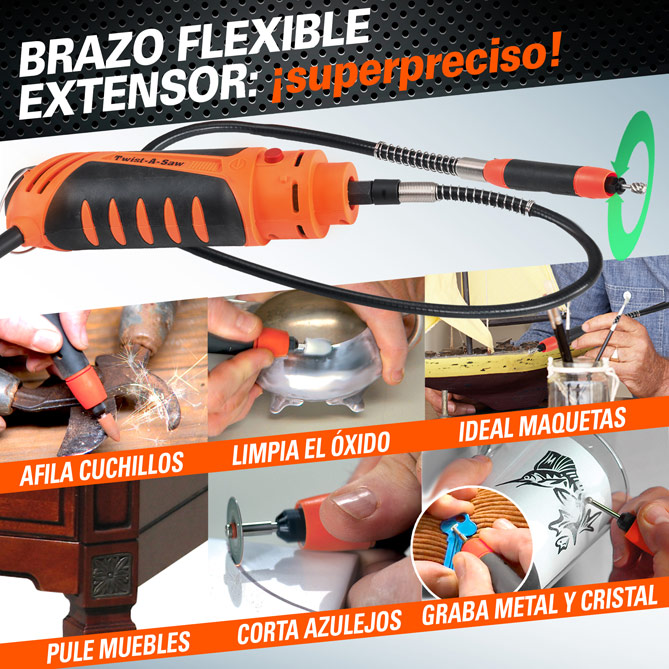 Supermanejable, permite acoplar las diferentes herramientas rotativas para afilar cuchillos y tijeras, grabar metal o cristal -incluye 40 plantillas de grabado-, pulir muebles -déjalos como el día que los compraste-, cortar azulejos, arreglar los “rayones” del coche, limpiar el óxido, construir maquetas... ¡MULTI TWIST hace mucho más de lo que imaginas!