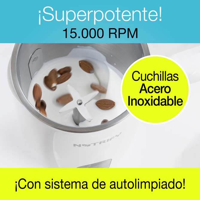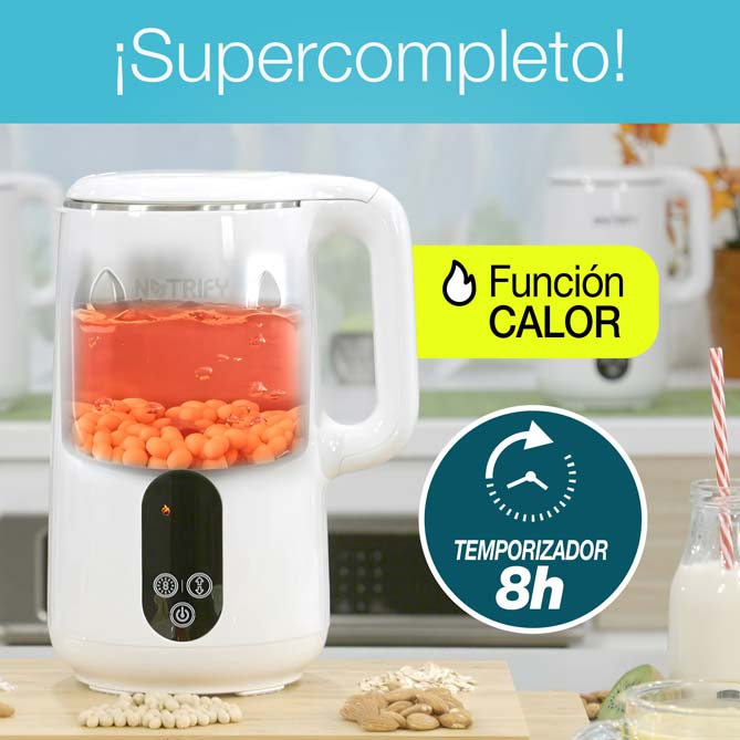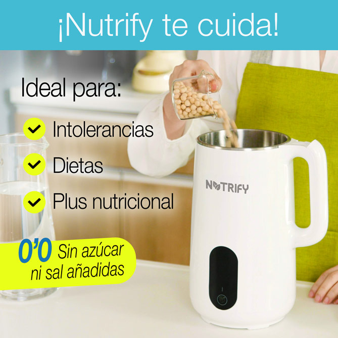 Si buscas una alimentación más saludable, rica en vitaminas y sin aditivos, Nutrify es tu mejor aliado. Este potente robot de cocina te permite preparar tus propias bebidas y comidas vegetales en casa, sin azúcares añadidos ni conservantes, y ahorrándote un dineral en el supermercado. Podrás hacer leche de soja, avena, almendras, anacardos, yogures cremosos, sopas deliciosas, aceites infusionados, batidos, gazpachos y mucho más. Nutrify es compacto, elegante, fácil de usar y de limpiar. ¡Es hora de vivir más sano y feliz con Nutrify!