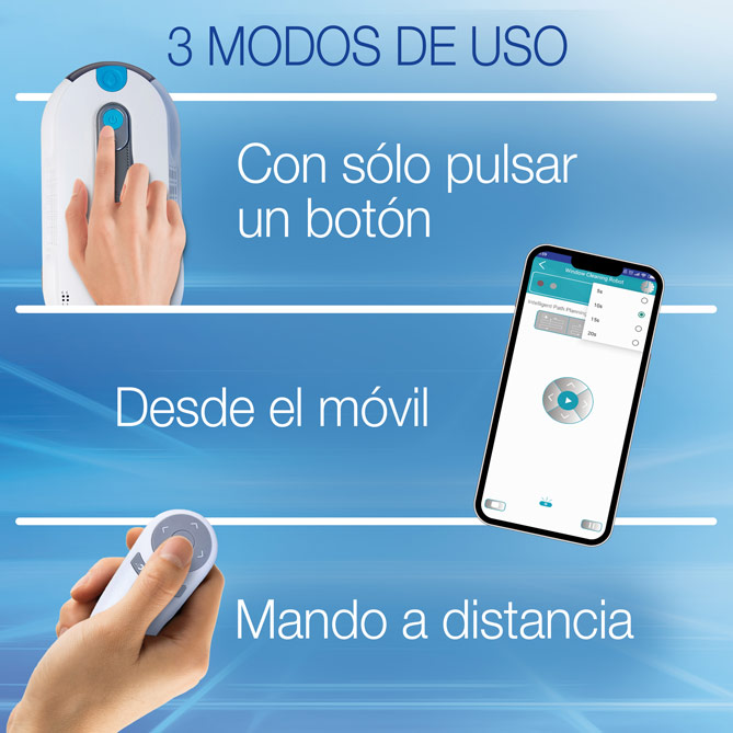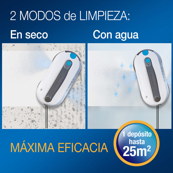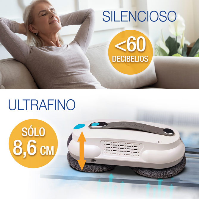 Silencioso y ultrafino, apenas 86 mm, ¡ni notarás que está funcionando! Con el mando a distancia podrás usarlo con toda comodidad: elegir la ruta, pararlo o volver a pasar por el mismo sitio todas las veces que sea necesario. Y si lo prefieres, podrás dirigirlo con el móvil. Y no sólo en ventanas y cristaleras, también puedes usarlo para encimeras, mamparas, mármoles y azulejos. ¡Toda la casa limpia y reluciente!