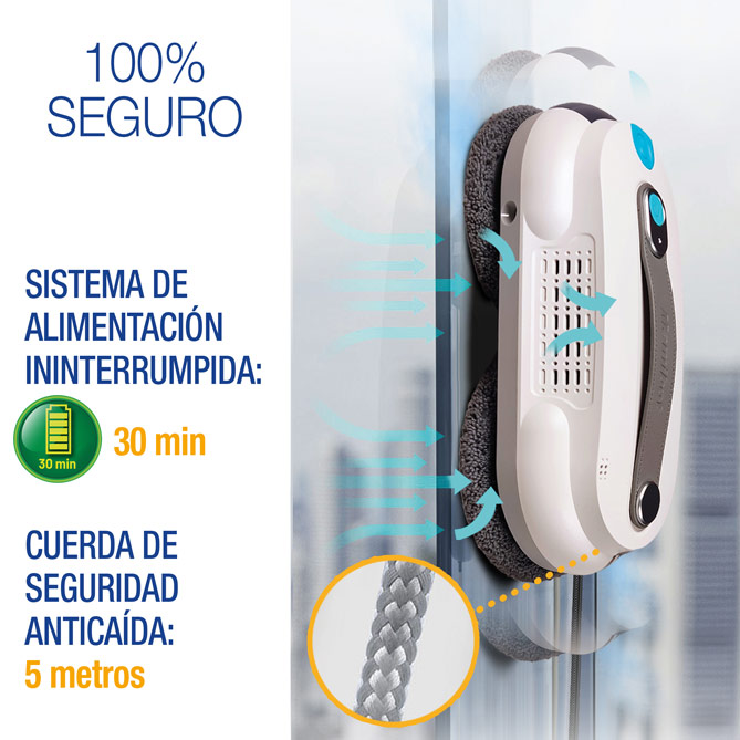 Mientras CRYSTAL Power limpia por ti, estarás tan tranquilo y sin preocupaciones haciendo cualquier otra actividad, porque dispone de los sistemas más avanzados de seguridad, incluso si hay un corte de corriente. Avisa mediante una alarma cuando acaba, tiene una autonomía de hasta 30 minutos que evita que se desprenda en caso de un corte de corriente, y una cuerda de seguridad anticaída con anclaje extra, capaz de soportar hasta 150 kg.
