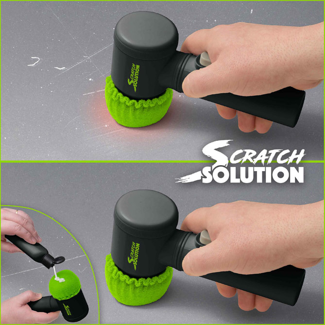 ¿Tu coche tiene arañazos, rallajos o golpes en la pintura? ¿Te gustaría librarte de ellos de una vez por todas sin gastarte una fortuna? Entonces necesitas Scratch Solution, la forma más fácil de arreglar arañazos y otras imperfecciones de la pintura instantáneamente. Sólo tienes que aplicar Scratch Solution en su pulidor, encenderlo, y pasarlo por encima. ¡En cuestión de segundos el arañazo habrá desaparecido!