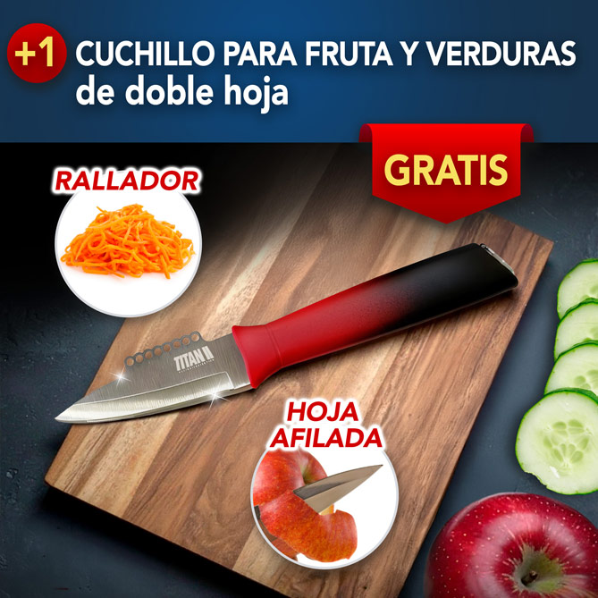 El Set de Cuchillos Titán incluye 3 cuchillos profesionales de doble hoja que combinan hasta 6 filos distintos, permitiéndote cortar, serrar, trinchar, filetear, pelar y rallar. Ahorrarás tiempo, dinero y espacio en tu cocina.