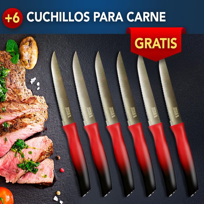 ¿Cansado de cuchillos sin filo que aplastan los alimentos, se pegan y te hacen perder tiempo en la cocina? Descubre el Set de Cuchillos Titán, la evolución definitiva en cuchillos de cocina profesionales. Un sistema revolucionario de cuchillos de doble hoja, tan afilados y versátiles que ni te imaginas lo que te vas a ahorrar en utensilios de cocina. Fabricados en acero inoxidable de alta calidad con recubrimiento antiadherente de titanio, los Cuchillos Titán ofrecen cortes precisos, limpios y sin esfuerzo en carne, pescado, frutas, verduras, pan y mucho más. Un set con 11 utensilios que harán que cocinar vuelva a ser un placer. Y ¿lo mejor de todo? ¡Pagas 1 y te llevas el set de 11 piezas completo!