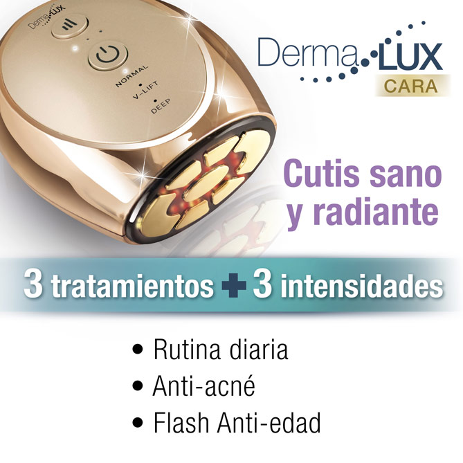 ¿Una piel más limpia y luminosa…? ¿Un efecto lifting…? ¿Quieres disminuir arrugas o líneas de expresión…? ¿Mitigar manchitas solares o de acné…? ¿Activar la producción de colágeno? Sea cual sea tu necesidad, los 2 Dispositivos Derma LUX te brindan una solución específica para cada problema de la piel, como si estuvieras en un Centro de Belleza ¡aunque sin sus costosas sesiones! No son promesas, es la Tecnología profesional más avanzada en tratamientos estéticos reunida en 2 Dispositivos de fácil manejo, que puedes usar en casa, y que combinan las Terapias más eficaces: