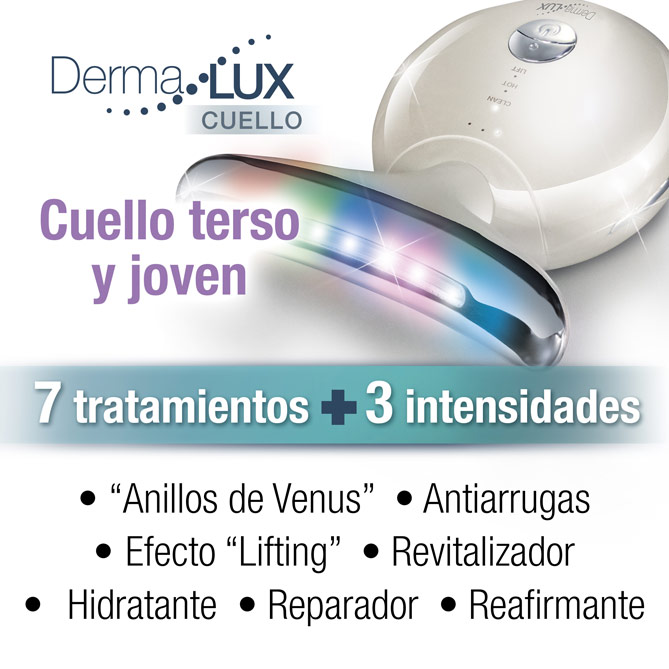 ¿Te imaginas que, con sólo pulsar un botón, pudieras detener el paso del tiempo en la piel de la cara, el cuello, las manos, el escote… ? Ahora es posible con Derma LUX: los 2 innovadores Dispositivos de belleza profesional para Cara y Cuello que, combinados, te ofrecen una experiencia de tratamiento completa. Podrás disfrutar de las 5 Terapias estrella, anti-edad y anti-imperfecciones de la piel, más aplicadas en las mejores clínicas estéticas del mundo ¡pero sin pagar sus costosas sesiones! Diseñados especialmente para tratar cada problema de la piel y adaptados para su uso en el hogar, sólo tendrás que pulsar un botón para cuidarte: así de sencillo… Y ahora, por tiempo limitado, están a tu alcance en unas condiciones excepcionales: ¡con una extraordinaria OFERTA 2x1 que te permitirá disfrutar de los 2 Dispositivos al precio de uno solo!