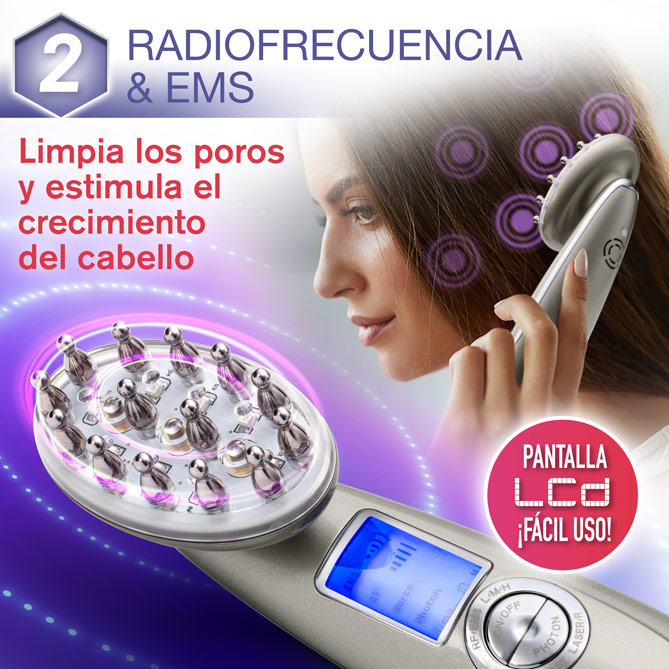 2-RADIOFRECUENCIA Y MICROCORRIENTE (RF/EMS). Limpia los poros bloqueados, además de activar los folículos pilosos en estado latente y consolidar su raíz. ¡Vida y fuerza para tu cabello!