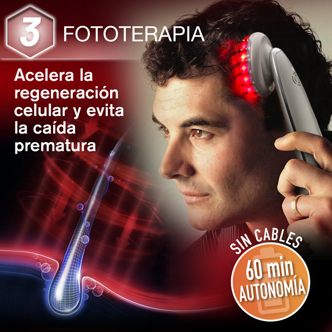 3-FOTOTERAPIA. Esta Terapia acelera la regeneración celular en los folículos pilosos para asegurar que las 3 fases del ciclo del cabello (crecimiento, regresión y caída) se desarrollan correctamente, lo que evita su caída prematura.