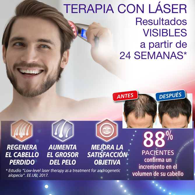 1-LÁSER SUAVE. Su baja longitud de onda es 100% segura, indolora y eficaz, gracias a sus 5 propiedades, avaladas por años de investigación: 1-Acelera la circulación sanguínea en el cuero cabelludo y facilita que el oxígeno y los nutrientes lleguen a los folículos pilosos; 2-Estimula el folículo piloso, lo que regenera el cabello perdido; 3-Reduce la secreción excesiva de grasa, una de las principales causas de pérdida del cabello. 4-Refuerza el sistema inmunitario, clave en la regeneración capilar; 5-Mejora la salud del cuero cabelludo y, en consecuencia, la calidad -brillo, firmeza, densidad y elasticidad- del cabello.