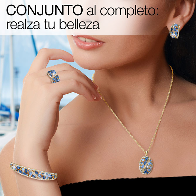 Con tallas de Alta Joyería, 481 Circonitas recrean la magia del mar Mediterráneo que baña las costas de Capri. Circonitas transparentes, prácticamente indistinguibles del Diamante, dibujando con maestría la espuma de sus olas... Circonitas en diversos tamaños y tonos de azul –Zafiro, Tanzanita, Aguamarina, Topacio London Blue...–, como los que pintan sus aguas y se funden con el cielo en el horizonte... Las 4 joyas del Conjunto CAPRI, bañadas en Oro de 1ª Ley, son un “trocito” del Mediterráneo.