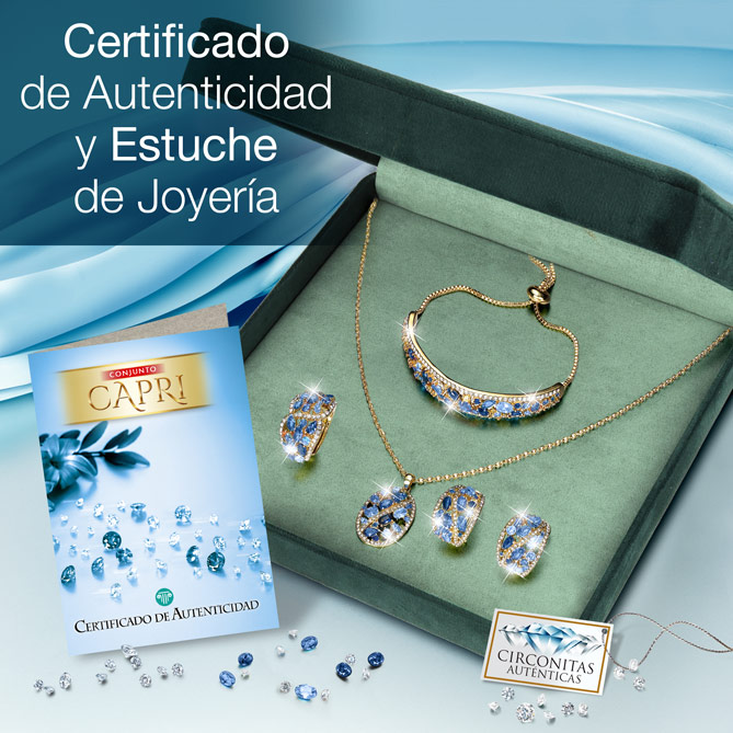 El Conjunto CAPRI se entrega en un elegante estuche de joyería, acompañado por su Certificado de Autenticidad que avala la calidad de los materiales empleados en su elaboración.