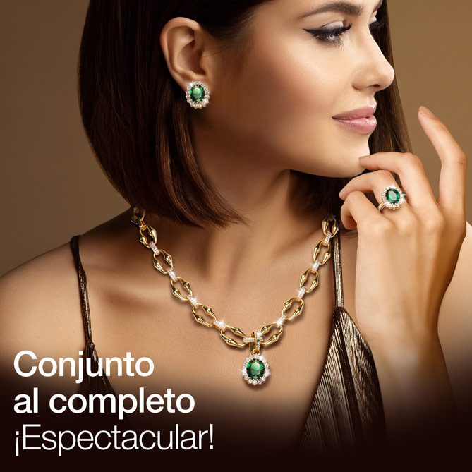 GLAMOUR ESMERALDA es la nueva definición de la elegancia: un Conjunto, bañado en Oro de 1ª Ley y con una genuina Esmeralda, hecho por y para ti, que amas las joyas perfectas. Sus 4 exclusivas piezas, en solitario o combinadas entre sí, te harán deslumbrar. Para empezar, su Cadena, con eslabones propios de los clásicos diseños de Alta Joyería, acariciará tu cuello con la luz infinita de las Circonitas... El espectáculo continúa con las 4 grandes Circonitas que coronan el Colgante, los Pendientes y el Anillo, en un trabajo orfebre majestuoso: cada una de estas magníficas Circonitas replica la magia de las valiosísimas Esmeraldas -su color, sus matices, su brillo...-. ¡Son prácticamente indistinguibles! Y para seguir cumpliendo tus sueños de lujo, una auténtica Esmeralda reluce en la argolla del Colgante. El colofón lo ponen las 214 Circonitas en tono Diamante que embellecen todo el Conjunto... GLAMOUR ESMERALDA es tan irresistible como tú.
