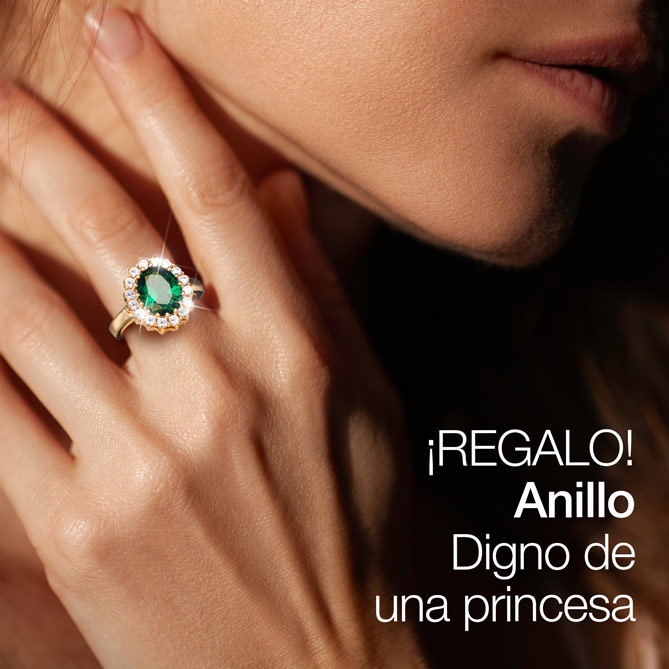 Bañado en Oro de 1ª Ley y con una auténtica Esmeralda: la Piedra Preciosa “fetiche” de las mujeres más elegantes. ¡Ahora con el anillo a juego de regalo!