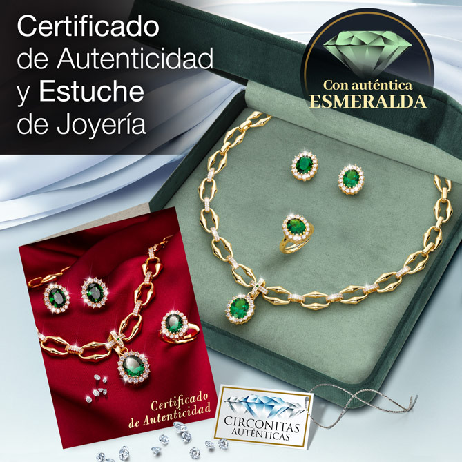El Conjunto GLAMOUR ESMERALDA se entrega en un elegante estuche de joyería y junto con su Certificado de Autenticidad< que avala la calidad de los materiales empleados en su elaboración.