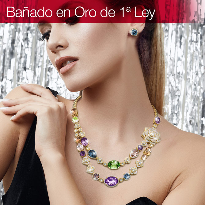 En el jardín del lujo florecen las Camelias… como en este espectacular Conjunto que vas a adorar. Su original Collar de diseño exclusivo, bañado en Oro de 1ª Ley, combina elaboradas flores de Camelia de diferentes tamaños, con grandes cristales de Circonitas en sus tonos más luminosos y especiales. El juego cromático que crea es mágico, un contraste perfectamente orquestado de colores, engastes y tallas digno de la Alta Joyería. A la originalidad del Collar se une la sutileza de los Pendientes, perfectos para lucirlos cada día. En total, más de 560 magníficas Circonitas -la sustituta perfecta de las Piedras Preciosas- llenan de luz y color ambos diseños. El Conjunto Jardín de Camelias te descubre el secreto de la elegancia: querrás vivir siempre envuelta en esta eterna primavera.