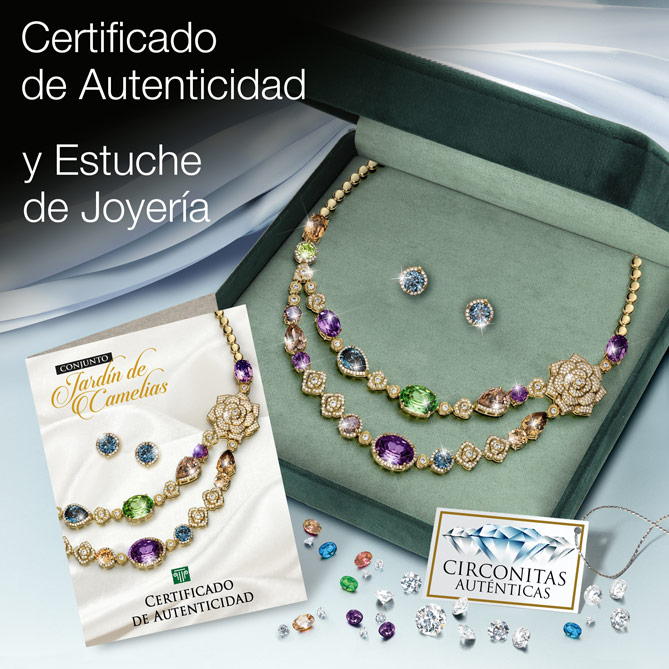 El Conjunto Jardín de Camelias se entrega en un elegante estuche de joyería y junto con su Certificado de Autenticidad que avala la calidad de los materiales empleados en su elaboración.