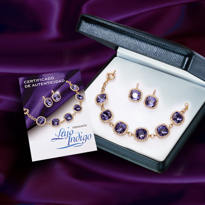 El Conjunto Lujo Índigo se entrega en un elegante estuche de joyería y junto con su Certificado de Autenticidad que avala la calidad de los materiales empleados en su elaboración.