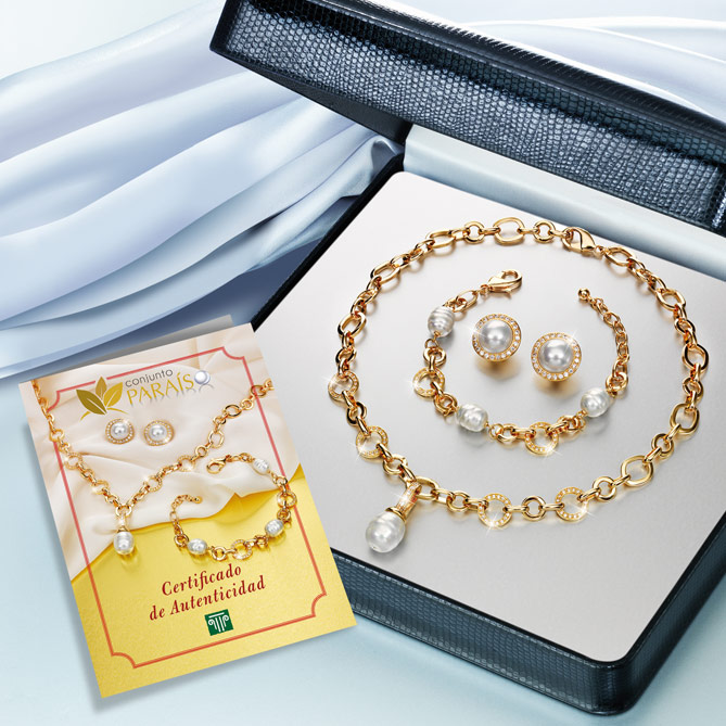 El Conjunto PARAÍSO se entrega en un elegante estuche de joyería y junto con su Certificado de Autenticidad que avala la calidad de los materiales empleados en su elaboración.