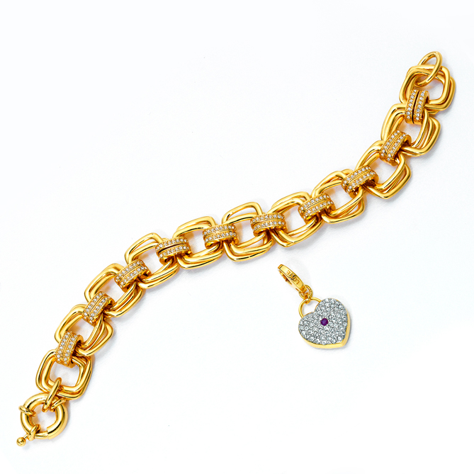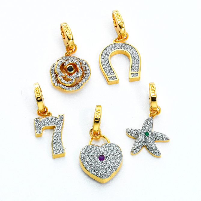 Cierra los ojos y piensa en la pulsera de tus sueños… ¡Aquí la tienes! Bañada en Oro de Primera Ley e iluminada con la luz del Rubí, Zafiro, Esmeralda y 515 Cristales de Swarovski®. Y con sus 5 charms “de quita y pon” –2 para llamar al amor y 3 para la buena fortuna– ¡atraerás siempre lo mejor de la vida!