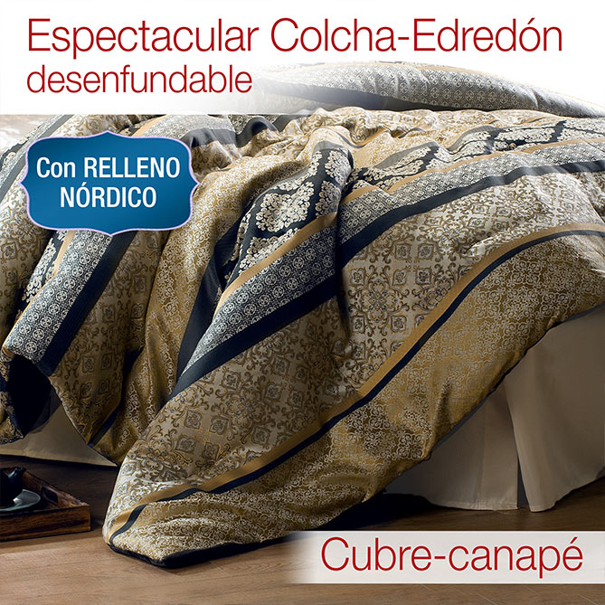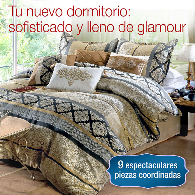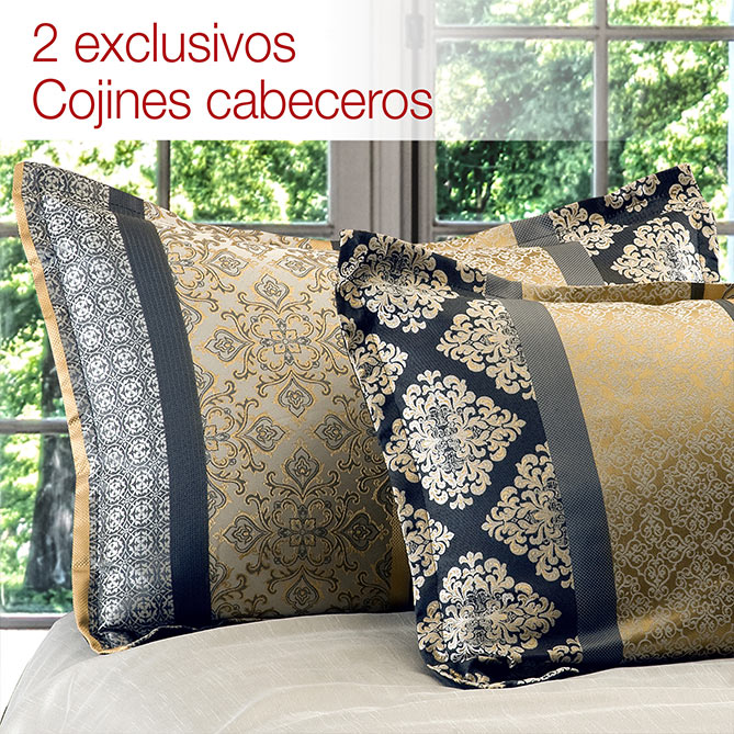 Dorados, beiges, azul muy oscuro, cobres, blanco roto... Los tonos, texturas y estampados que se combinan en este original Conjunto dan vida a la tendencia clásica, inspirada en el lujo oriental, que está tan de moda. Sofisticado y lleno de glamour, sus originales y exquisitos acabados junto con los detalles de pasamanería que lo adornan dejan claro que este Conjunto es muy exclusivo: puro lujo para tu dormitorio, diseñado para hacer confortable cada una de tus noches ¡e iluminar con su estilo cada uno de tus días!
