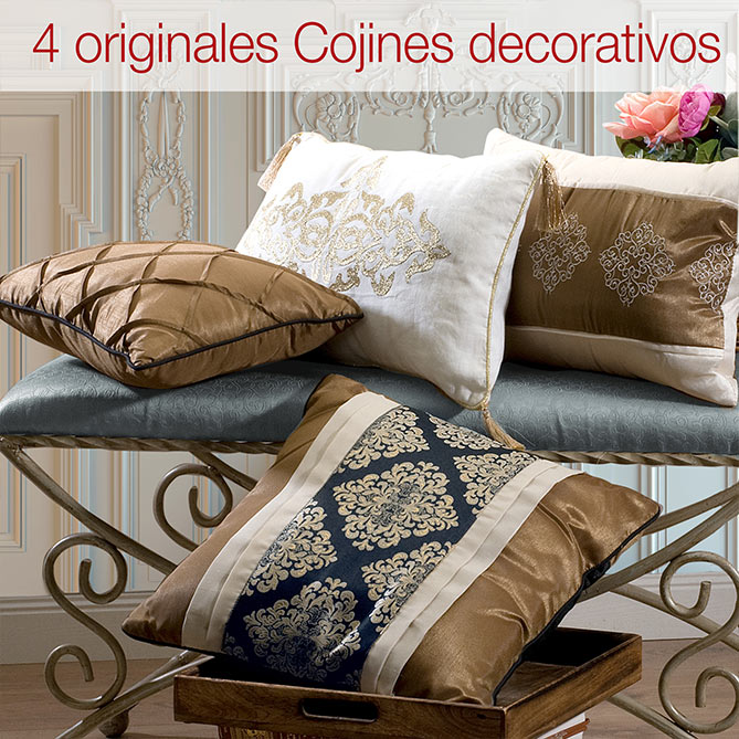 Medidas: Cojín cuadrado (con relleno) de 45 x 45cm. Cojín rectangular tono beige/dorado (con relleno): 30 x 50 cm; Cojín rectangular tono cobre (con relleno): 30 x 45 cm; Cojín rectangular beige/cobre (con relleno): 30 x 50 cm