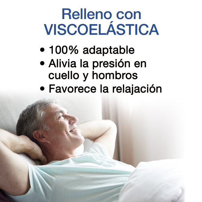 Su relleno con espuma Viscoelástica te ofrece un soporte firme pero flexible a la vez, que se adapta a cualquier posición -ya sea de lado, boca arriba o boca abajo- para aliviar la presión en cuello y hombros, y proporcionarte un descanso 100% reparador que te permitirá levantarte cada mañana como nuevo.
