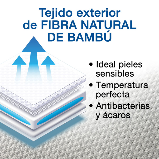 Y gracias a su innovador tejido exterior de Fibra de Bambú, suave y transpirable, regula la temperatura ofreciéndote el confort perfecto en cualquier época del año. Además, al ser Hipoalergénico evita bacterias, ácaros y molestas alergias.