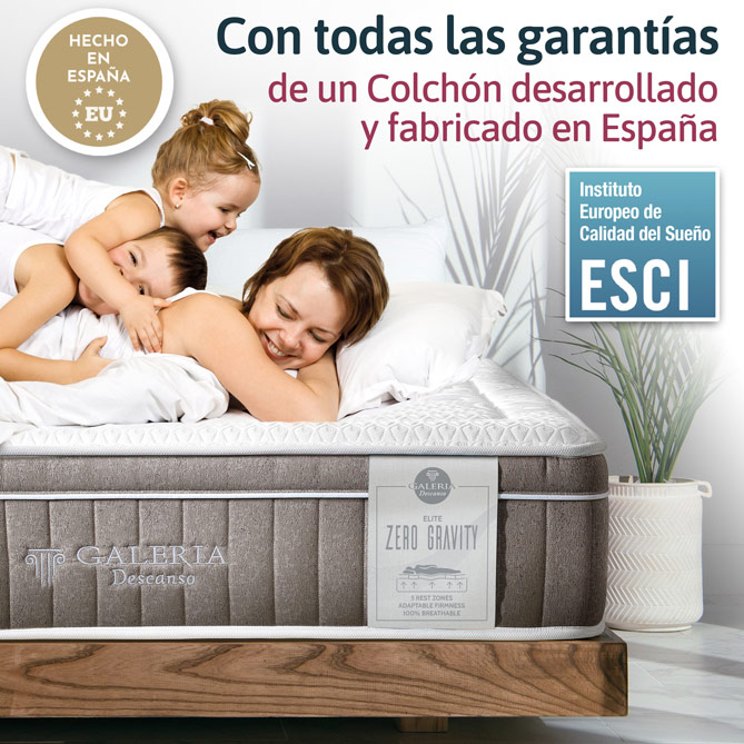Los expertos confirman que la postura al dormir influye en la calidad del sueño y en el bienestar general. Por eso, para descansar “de verdad” y levantarte sin molestias en el cuello o la espalda, necesitas un Colchón “personalizado” que se adapte a ti. Como ELITE ZERO GRAVITY, desarrollado por el Instituto Europeo de Calidad del Sueño (ESCI) con los últimos avances en ergonomía. Para empezar, tiene 5 zonas de descanso diferenciadas, con mayor firmeza donde tu cuerpo lo necesita, que distribuyen tu peso de forma natural y cuidan tu salud postural... Además, su innovador núcleo de Muelles Ensacados ofrece máxima transpirabilidad para una temperatura perfecta todo el año y libertad de movimientos ¡sin molestar a tu pareja! Supercómodo, fabricado en España con materiales de Alta Gama y 30 cm de grosor, disponible en todas las medidas y con Almohada/s de Regalo, ELITE ZERO GRAVITY se ajusta a tus necesidades de descanso. Cuando lo pruebes, ¡no querrás dormir en otro Colchón!